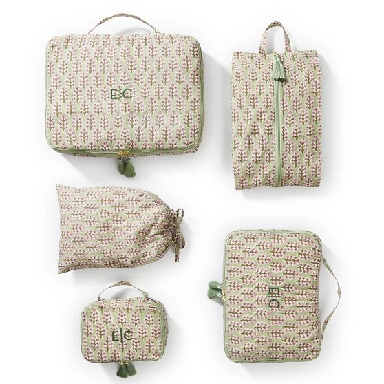 Our favorite travel organization essential, now in exclusive patterns made with the time-honored tradition of Indian block printing. Designed to help you maximize space and keep organized, these cotton packing cubes will keep your clothes neat and compressed so you can fit more into every trip. This set includes three packing cube sizes, one fabric bag for shoes and one for laundry. Add an embroidered monogram for a personal touch.