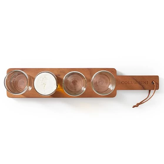 • Acacia wood paddle with leather strap and 4 glass tasters.