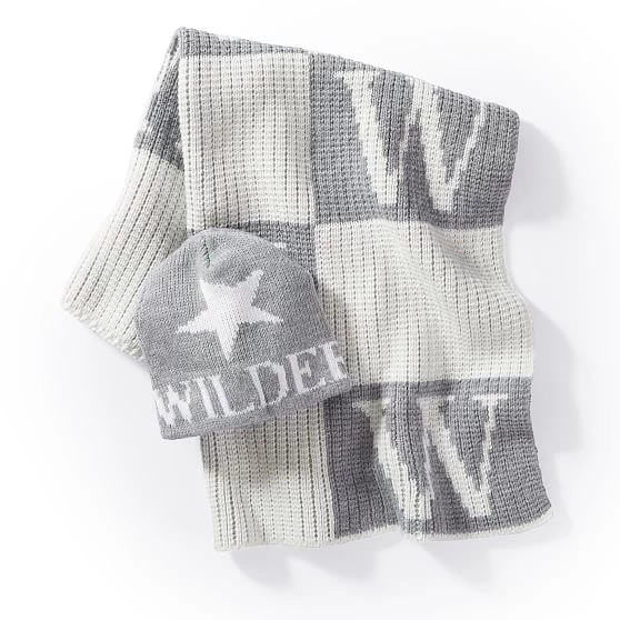 • Monogramming is knit into the blanket and hat.