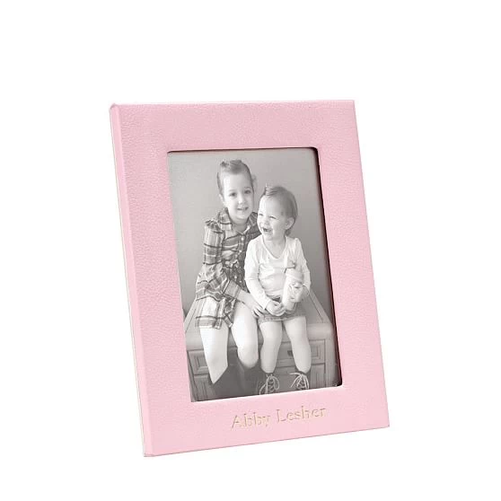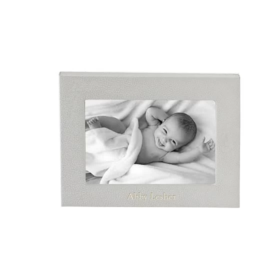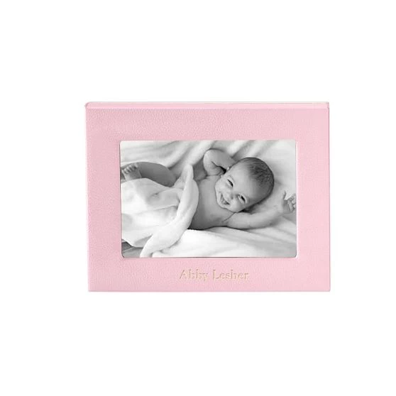 Capture all the precious moments with this personalized photo frame. This 5×7 frame is wrapped in a beautifully soft full grain leather. Add a name, date or special message to the frame for a thoughtful baby shower, new arrival or first birthday gift.