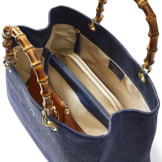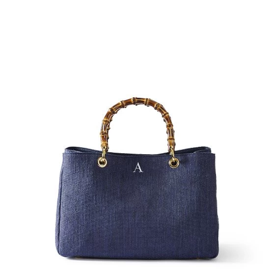 This stunning summer-inspired handbag is handcrafted from Italian raffia with polished bamboo handles. Thoughtfully constructed with an internal zippered section that divides the bag into three compartments, the classic silhouette is both simple and elegant, polished enough for formal occasions and relaxed enough for everyday use. Embroider a monogram to add a personal touch to this luxe gift for yourself or your favorite person.