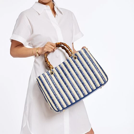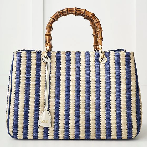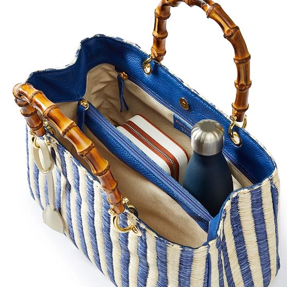Part of our iconic Elisabetta collection, this stunning summer-inspired handbag is handcrafted with contrasting stripes of a durable raffia-like material with polished bamboo handles. Thoughtfully constructed with an internal zippered section that divides the bag into three compartments, the classic silhouette is both simple and elegant, polished enough for formal occasions and relaxed enough for everyday use. Add a monogram for a personal touch to this luxe gift for yourself or your favorite person.