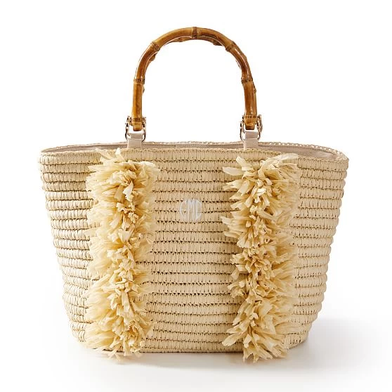 Go from days by the pool to nights on the town with this versatile satchel bag. Woven from natural paper straw with a fringed flourish, it features a statement handle made from polished bamboo for a classic finishing touch. The spacious, linen-lined interior carries all your essentials with ease. Add a custom embroidered monogram in your favorite color to make it uniquely yours.