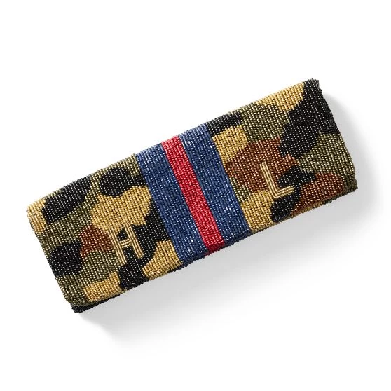 A stunning clutch made just for you. Beautiful glass beads are intricately handwoven to create a playful camo print clutch that you can customize with your monogram for a personal touch.