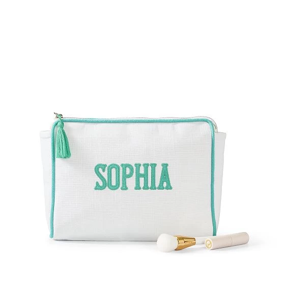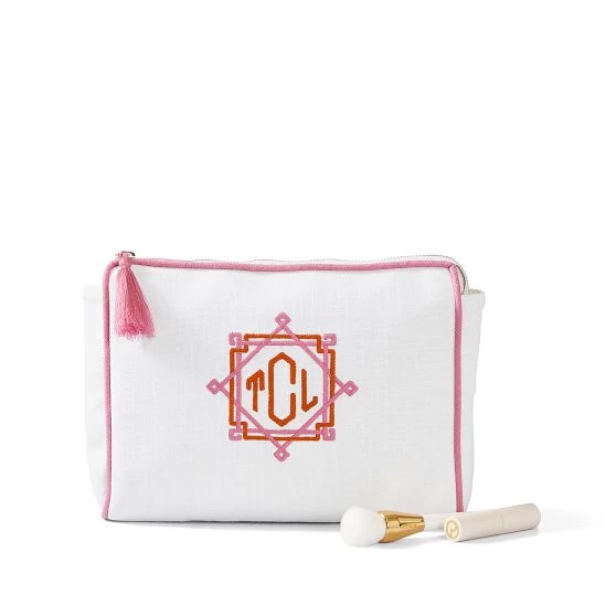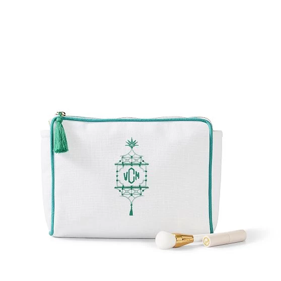 Organization and elegance are far from mutually exclusive, as these lovely bespoke pouches prove. Inspired by crisp yet intricate chinoiserie décor and designed with everything from baby care to beach days in mind. The perfect size for cosmetics or other small essentials, use it in your luggage when packing for your next getaway. Crafted from durable cotton with a wipeable interior lining, the pouch features your choice of a custom name or ornate monogram design, with color coordinated piping and a silky tassel zipper pull.