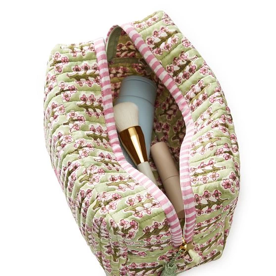Add some personal style to you travel essentials with these lovely pouches. Crafted from quilted cloth in exclusive patterns made with the time-honored tradition of Indian block printing, use them to stylishly store toiletries on your next getaway, or as eye-catching organization around your home. Contrast piping and silky tassel zipper pulls add a finishing touch to the design, as does a custom monogram.