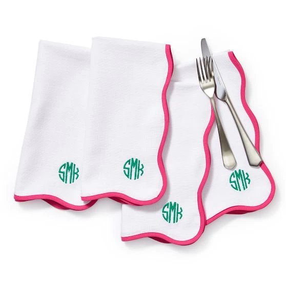 The perfect finishing touch on a stylish table setting, these napkins put a charming twist on crisp linen with a scalloped edge trimmed in a pop of color. Add a classic bespoke flair with an embroidered monogram. Makes a lovely gift for new couples or your favorite dinner party host.