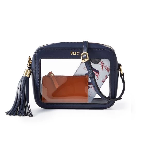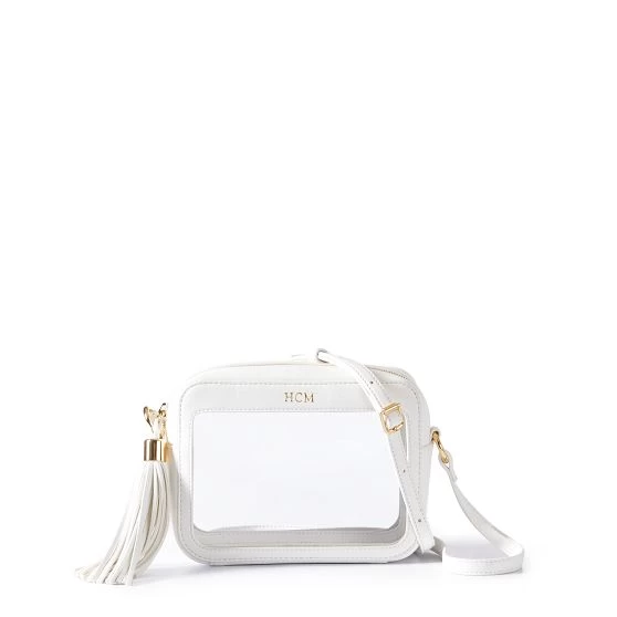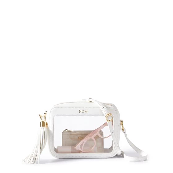 The Build Your Clear Crossbody is crafted from a clear vinyl and finished with a playful tassel and gold hardware.