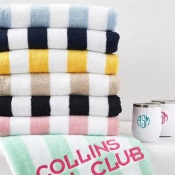 Make a statement on the sand with these colorful and customizable beach towels. Made from Turkish Aerospin™ cotton, each towel is woven using an advanced spinning technique that allows air to pass through the fibers, making it incredibly soft and super absorbent. Perfect for lying on the sand or relaxing by the pool. They’re generously sized and dry quickly. Embroider with the name of your boat, beach house or BFF for a playful personal touch.
