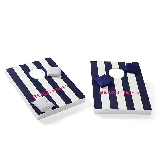 Whether you’re barbecuing, hosting a garden party or want a fun game to play at an outdoor wedding, our bean bag toss set in summery cabana stripes is the perfect way to bring family and friends together. These portable boards are designed for easy transport with integrated handles and foldable legs. The set includes two boards and eight color coordinated bean bags that come in a handy travel tote. Add a monogram for a personal touch or to commemorate a special event such as a wedding or anniversary.