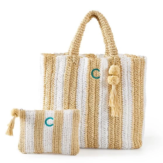 We love the natural, easy-going shape of this crocheted straw bag and pouch pair. Easily carry bigger items like a towel or your favorite wine in the tote, while keeping smaller items like sunscreen and hotel keys organized in the matching pouch. Classic bold stripes bring a pop of style and adding a monogram lends that one of a kind touch.