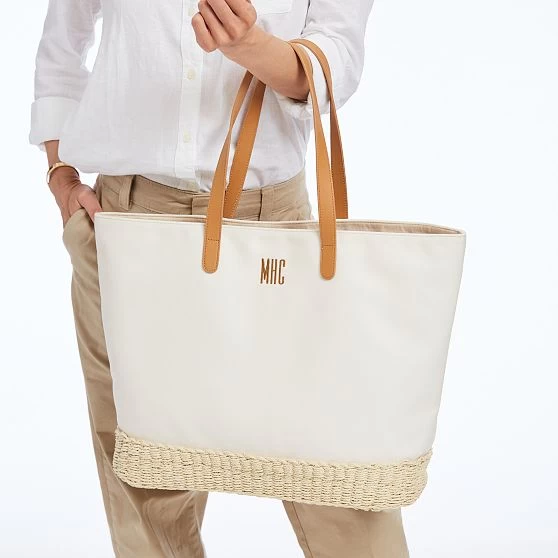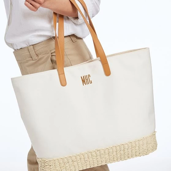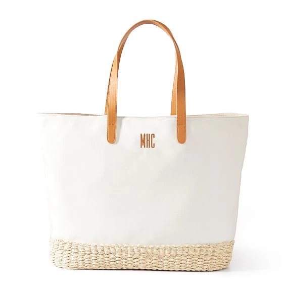 Designed with summer in mind, this unique tote is crafted from canvas for durability with a woven straw base for stability and a touch of coastal style. A pair of leather handles allow for easy toting, while the open-top design keeps everything close at hand. Add an embroidered monogram to make it one of a kind.