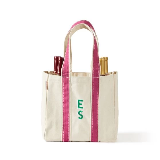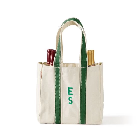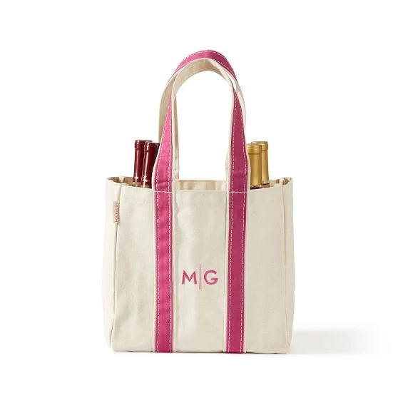 Made from durable cotton canvas, this casual wine tote holds up to four bottles and can be embroidered with a monogram for a personal touch. The Velcro bottle divider and flat bottom support keep bottles steady during transit—a must-have for transporting drinks to picnics and beach days (and everything in between).