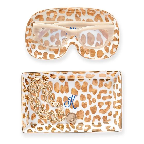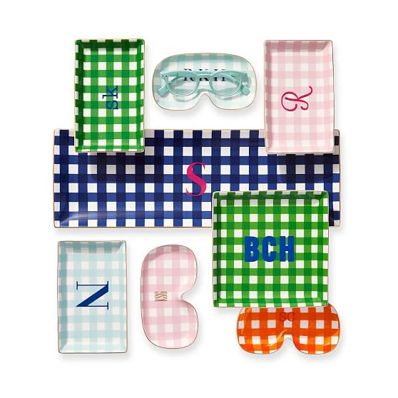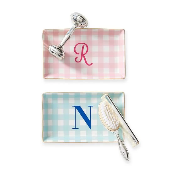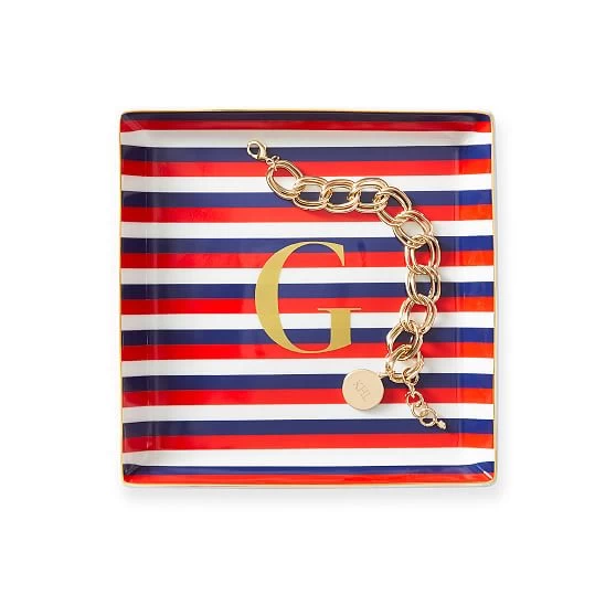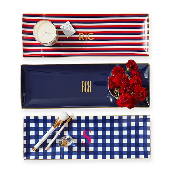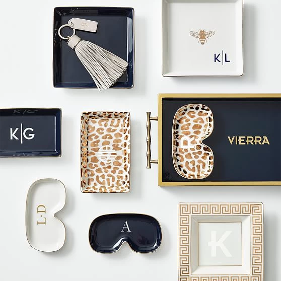 Elegant organization at its finest, our latest collection of square and rectangle ceramic catchall trays are crafted from ceramic porcelain and feature a hand painted gold rim with graphic patterns and designs that feature decal monogramming.