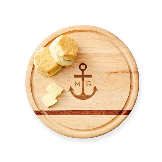 Handcrafted from sustainably grown and harvested maple and mahogany wood, this round cheese board features a beautiful single stripe design and a deep grooved edge that makes it perfect for carving, kitchen prep and serving your favorite appetizers. Customize the cheese board with an engraved monogram, name or special message for a one-of-a-kind gift.