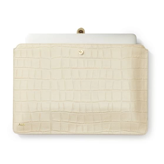 The Classic Collection: the quiet luxury of leather, designed for everyday use. A sleek accessory for your work essentials, use this leather laptop sleeve on its own as a portfolio clutch or for extra organization and protection in your commute tote. Crafted from premium leather with a magnetic snap closure. Add your monogram for a sophisticated personal touch.