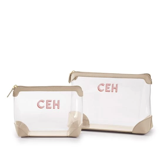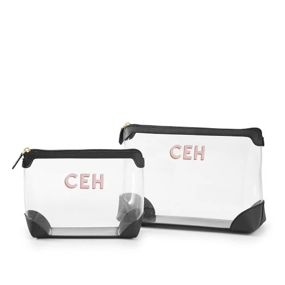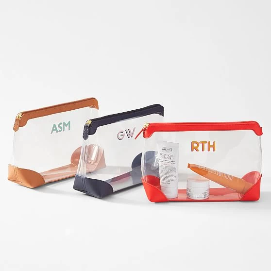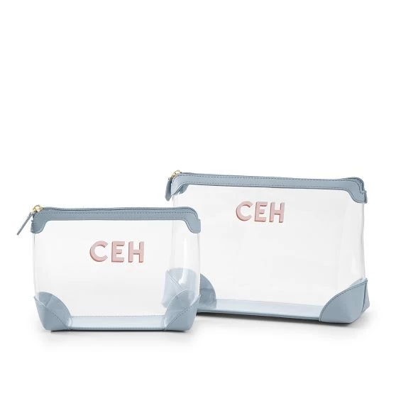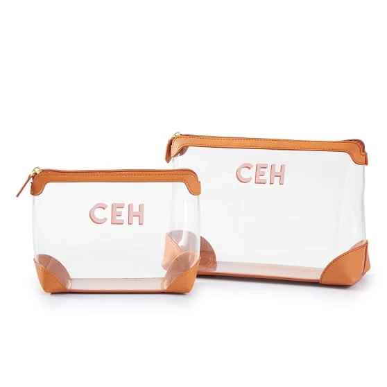 The perfect duo to keep travel essentials organized, these colorful pouches are made from eco-friendly, biodegradable and solvent-free TPU with vegan leather trim. The set includes a small and large pouch for cosmetics and toiletries and the transparent exterior makes it easy to see what’s inside and simplifies airport security. Add a shadow printed decal monogram to the set for an easy gift for the traveler.