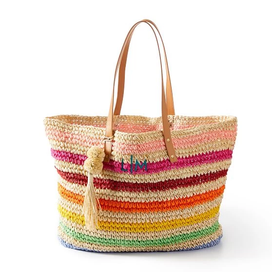From beach days to warm-weather wine tasting, this colorful straw tote is sure to bring both fun and sun to your bag collection. Made from raffia-like paper straw with two vegan leather handles for comfortable carrying. The open crochet construction means when you take this bag to the beach, the beach won’t come home with you—simply shake it to let go of sand. A pom pom tassel adds a playful touch, while adding a monogram makes it one of a kind.