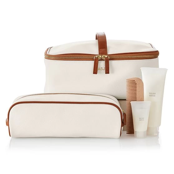 Made from lightweight vegan leather, this versatile case is perfect for travel. Unzip the main cosmetics case to reveal a bonus smaller pouch so you can keep all your daily essentials organized at home or away. Add an embroidered monogram and gift it to yourself or your favorite person.