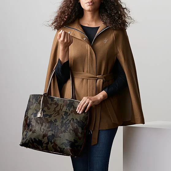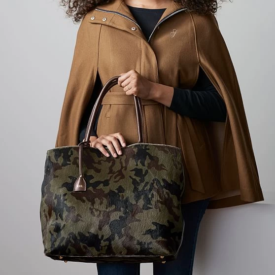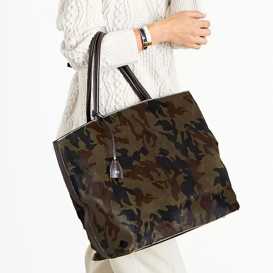 Handcrafted in Italy from the highest quality hides, the Dakota Hide Bag adds a touch of luxury to the classic tote design. This tote features a distinctive print with soft leather handles and side detailing. The spacious interior is lined with black grosgrain and has multiple open pockets for organizing your daily essentials. With a magnetic closure, generous handles and a foil debossed monogram on the removable leather tag, this beautiful hide tote will become your new favorite handbag.