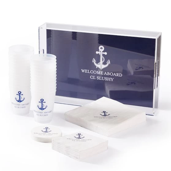 Impress your guests and make any event memorable with this deluxe party set. With shatterproof cups, cocktail napkins, dinner napkins, paper coasters and a personalized Lucite tray with a fun pattern of your choice, this coordinated set will add a personal touch to any gathering. Perfect for backyard entertaining, picnics in the park, or wedding parties. All items can be personalized to match and the cups, napkins and coasters are available in sets of 25, 50 or 100.