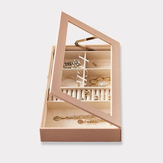 Keep your favorite jewelry organized and protected in this beautiful dresser top jewelry box. With a glass lid that makes it easy to find the pieces you’re looking for, the thoughtfully designed organizer is divided into five compartments that feature an anti-tarnish micro suede lining to keep your jewelry shining. Add an etched monogram to the glass top for a personal touch.