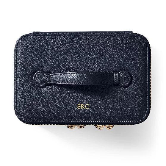 Meet your new favorite travel organizer. Crafted from vegan leather, this carry case is thoughtfully designed with dual compartments for cosmetics and jewelry. On top, the divided compartments and zip pockets keep small pieces like rings separate and stored, while below a large zippered compartment is perfect for makeup and more. Add a foil debossed monogram for a personal touch.