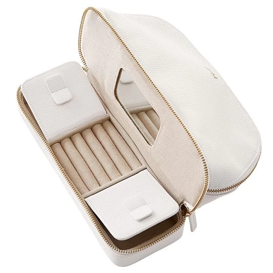 Thoughtfully designed with dual compartments to keep cosmetics and jewelry organized while you travel, this set makes the perfect gift for your favorite jetsetters. Crafted from soft vegan leather, these dual organizers have zippered pockets on top with a wipeable lining for toiletries and makeup and a bottom compartment to keep your favorite jewelry safe and untangled. Add a foil debossed monogram for a personal touch.