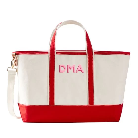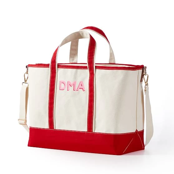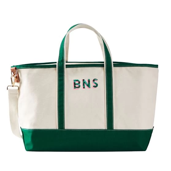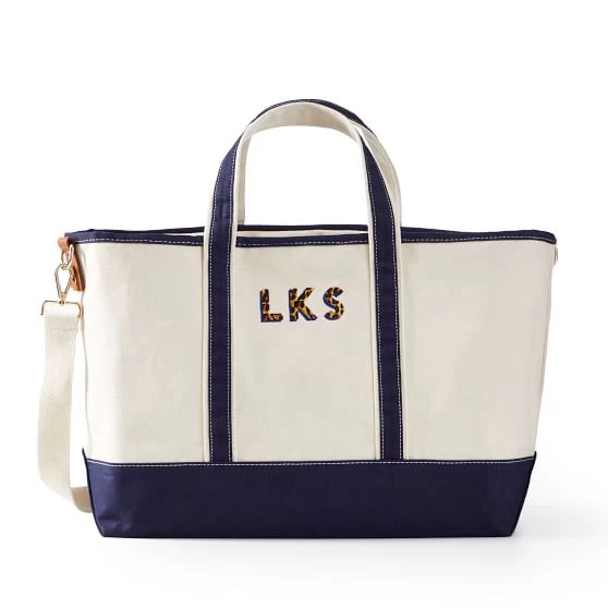 Whether by boat, plane or automobile, this weekender bag will help you get away in style. Made from durable cotton canvas, the Embroidered Canvas Overnighter features a two-color embroidered monogram that you can customize in a range of colors and patterns, including leopard and camo. Leather and brass detailing combine with a reinforced base for extra durability. Plenty of room to pack for a weekend, plus a top zipper closure to keep it all safe.