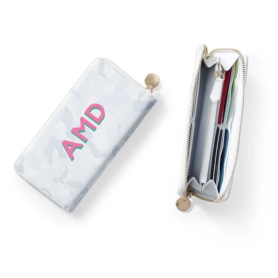 An everyday essential. This classic design has everything you could wish for in a wallet; 12 credit card slots, 2 billfolds, a middle zip pocket and a variety of colors to choose from. Crafted from leather with a zip-around closure and a gold disk pull to keep daily essentials secure. Add a custom digitally printed monogram for a personal touch