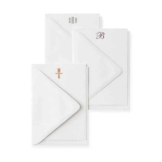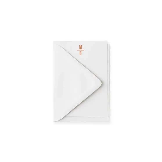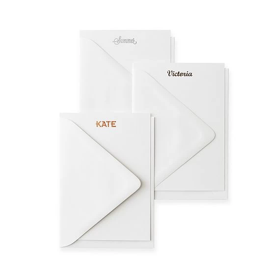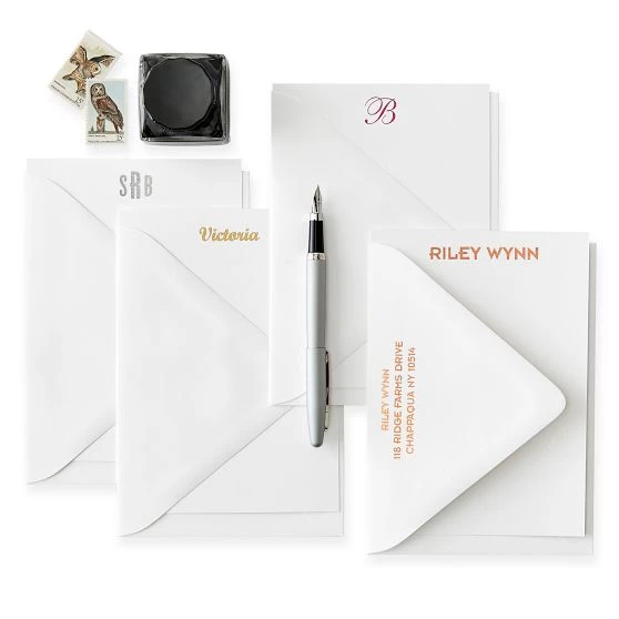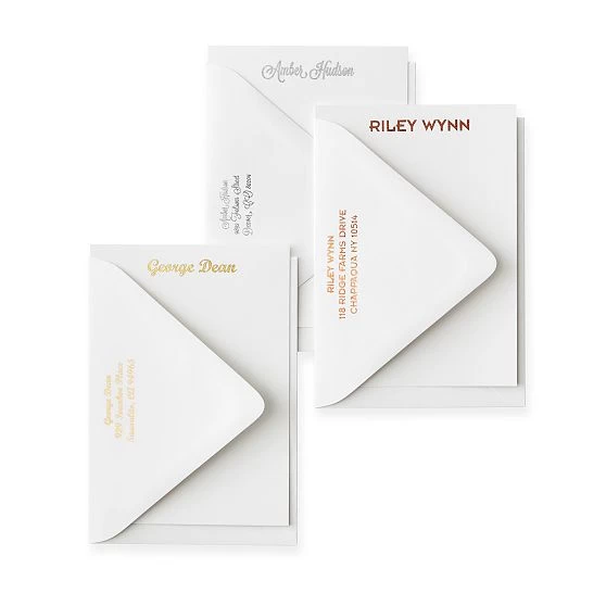 Bring back the lost art of letter writing or offer up the perfect first-anniversary gift. We’ve created this exclusive set of 50 foil-stamped cards and envelopes: available in an array of metallic colors, these vertical orientation cards feature your monogram, name or family name, as well as the option of adding a return address on the envelopes.