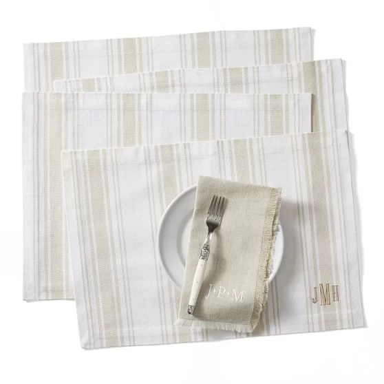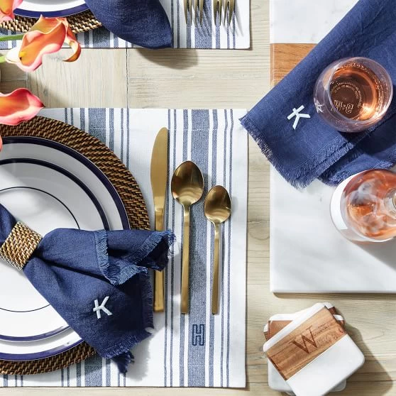 Dinner party ready. Woven from yarn-dyed cotton for vibrant, long-lasting color, this set of four placemats are the perfect way to add a touch of classic elegance to your table. Layer this set with our French Stripe Table Runner for a coordinated look or mix and match with our other table linens for a more eclectic tablescape. Add an embroidered monogram for a personal touch.