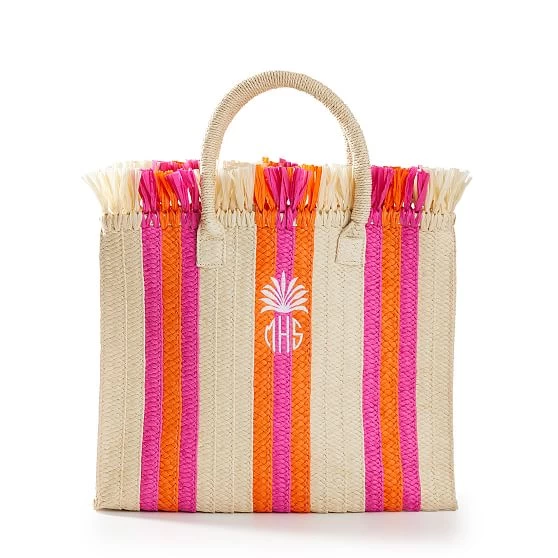 The perfect spring tote, this gorgeous carryall is artfully woven from natural straw with a striped design and finished with fringe detailing. The sturdy carry handles are wrapped for comfort and the embroidered monogram adds the perfect personal touch.