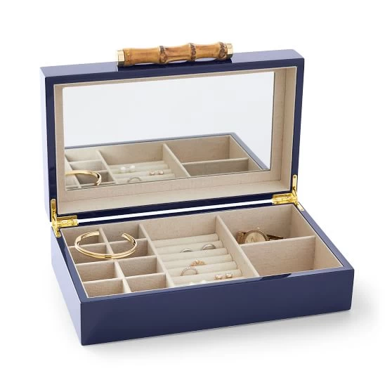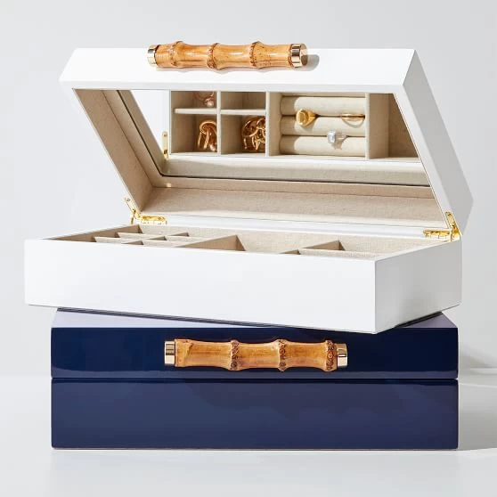 Keep your favorite pieces organized and protected in this glossy, lacquered jewelry box that features a bamboo handle, gold hardware accents and a linen-cotton lining. Add a vinyl decal monogram to the top for a personal touch—for yourself or for the accessories-lover in your life.