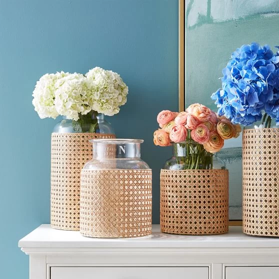 Classic coastal style. This set of handcrafted cane webbing vases looks simply stunning in a vignette on your console table. Fill with pampas grass or another decorative flourish to bring instant texture to your arrangements. The two different vase heights add visual interest, and monogrammed emblems on each tie together decorative displays. A great housewarming gift for yourself or that special someone, these glass and cane vases are sure to become a beloved part of your home in every season.