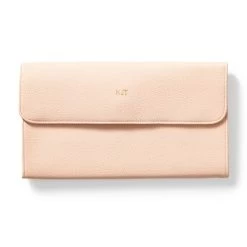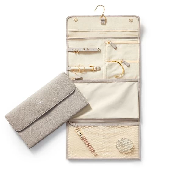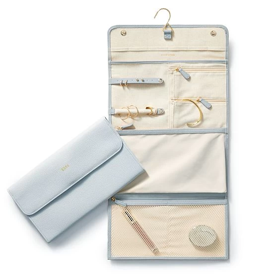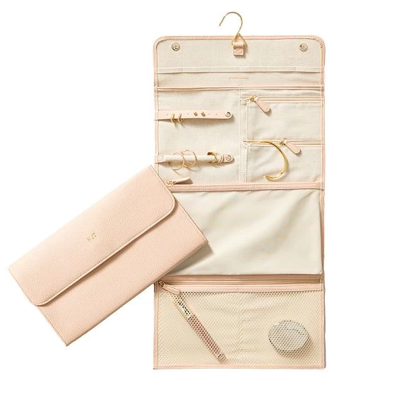 This versatile organizer is thoughtfully designed to keep your favorite jewelry and cosmetics organized while you travel. The tri-fold design saves space when packing and the hanging hook makes it simple to store wherever you are. The top section features multiple compartments to keep rings, earrings, and necklaces organized and untangled, while the bottom zipper compartments safely store makeup brushes and small cosmetics. Add a classic foil monogram for a personal touch.