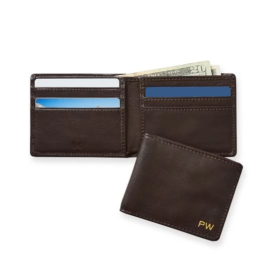 Crafted from rich chocolate leather with a slightly pebbled finish, this classic design features a bifold opening with six credit card slots, a bills and receipts pocket and plenty of room for cash and business cards. Add a foil debossed monogram for a personal touch.