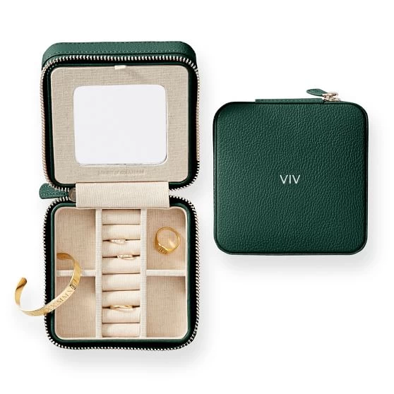 Beautiful and functional, the travel jewelry case is perfect for organizing jewelry at home or away. Thoughtfully designed with cushioned storage for rings, multiple compartments for earrings and necklaces and a mirror for getting ready on the go. Just the right size for a weekend away or when you only want to pack your most-loved pieces, this square zippered case is our most popular gift with textured vegan leather and a soft linen lining.