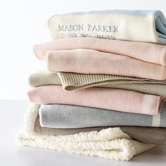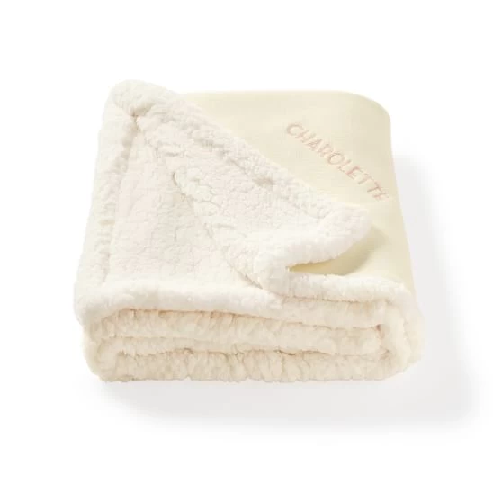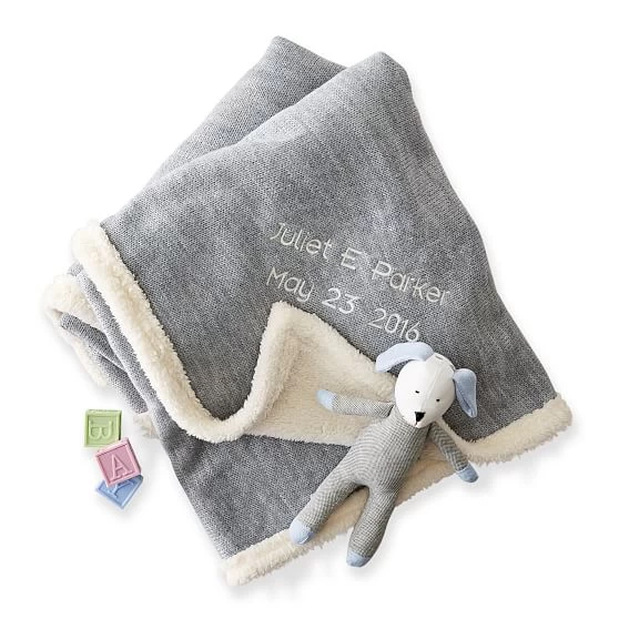 A cozy companion for strolling or the crib: warm knit on one side, sherpa fleece on the other, this stunningly soft blanket makes a comforting gift for new parents. Add an embroidered name and birthday.