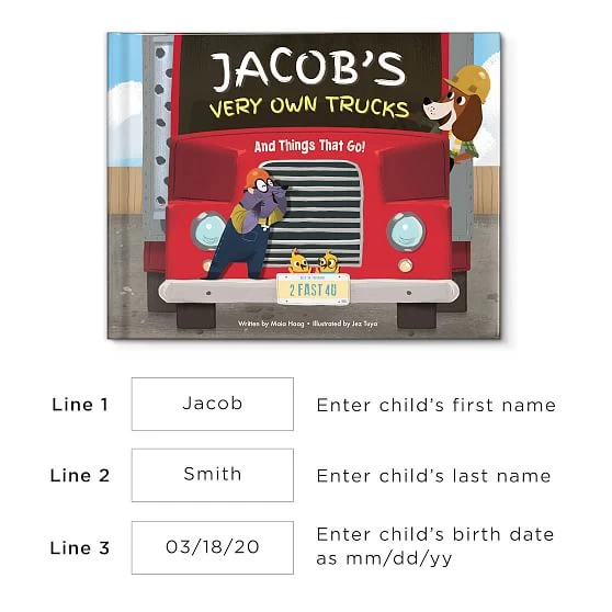 Your child will love seeing his or her name being spelled out letter-by-letter by the trucks and things-that-go in this uniquely personalized storybook! The Ambulance brings the A, the Crane brings the C, the Skid Steer Loader brings the S and so on. As the story progresses, the vehicles construct your child’s name on scaffolding, and at the end they celebrate by tooting their horns and shining their lights on the wonderful name that they have built.