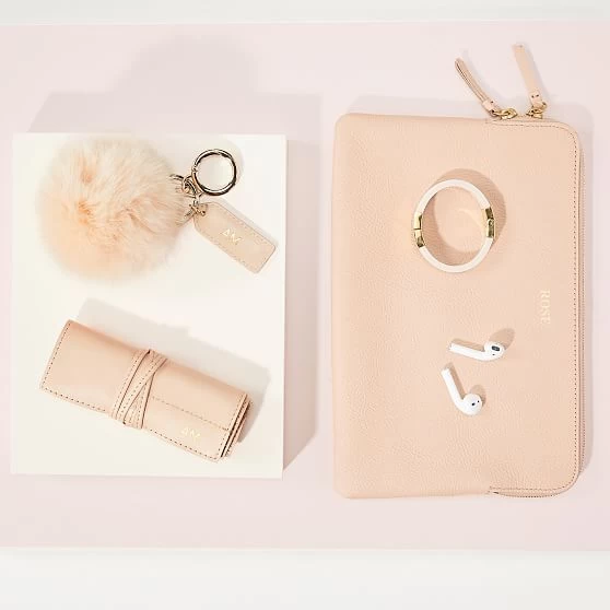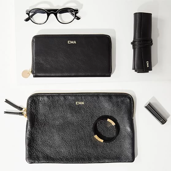 Add your small essentials to the pockets inside, roll it up and secure with the leather tie to keep organized on the go. For an easy gift, have their initials hand stamped in colored foil or opt for blind debossing which adds texture, without color to the leather.