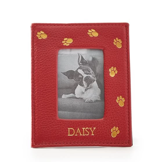 Show off your favorite puppy picture in this Pet Photo Frame. The durable metal frame is wrapped in beautiful Italian leather and decorated with fun paw prints. Have your dog’s name pressed into the leather with colored foil for an extra special touch.
