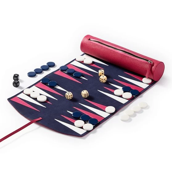 Gammon your friends on the go: this superbly sleek travel-ready set contains everything you need for high-stakes backgammon tourneys on the plane, in the park, by the pool, at the pub or on the beach. Leather on the outside, linen on the inside, the pack and its wooden pieces roll up and are neatly secured with a metal buckle. Game on!