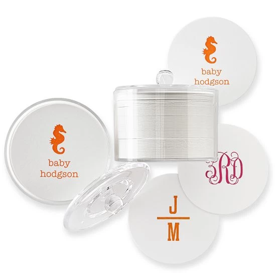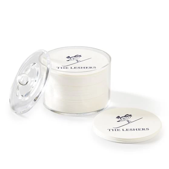 These paper coasters are great for patio parties, top-tier tailgating, al fresco fetes or wilderness weddings. They can be housed in a handy lidded acrylic holder. The letterpressed monogram can be coordinated with our stadium cups and paper linens, for coolly coordinated entertaining.