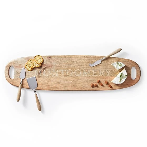 Crafted from natural reclaimed mango wood, this extra long board is perfect for serving up a full charcuterie, tapas or your favorite appetizers. Treated with food-safe wax, the full set comes with 3 cheese knives. Add an engraved monogram for a personal touch—perfect for gifting favorite host with the most.