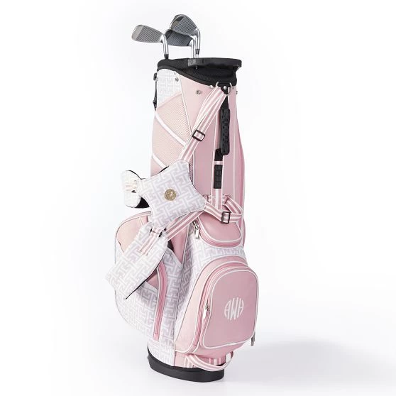 Designed in collaboration with Spartina in exclusive colors and patterns, this golf bag pairs sleek functionality and uncompromising style. Features an abundance of pockets for everything you need for a day on the green, including a fleece lined pocket for your phone, an insulated pocket for your water bottle and small loops for tees or golf pencils. Lightweight and easy to carry with nylon mesh padded straps, it also stands up on sturdy kickstand legs. Made from weather, dirt and tear-resistant nylon that can endure heavy use, with a snap-on rain cover for extra protection. Add a classic embroidered monogram to put your own spin on it.