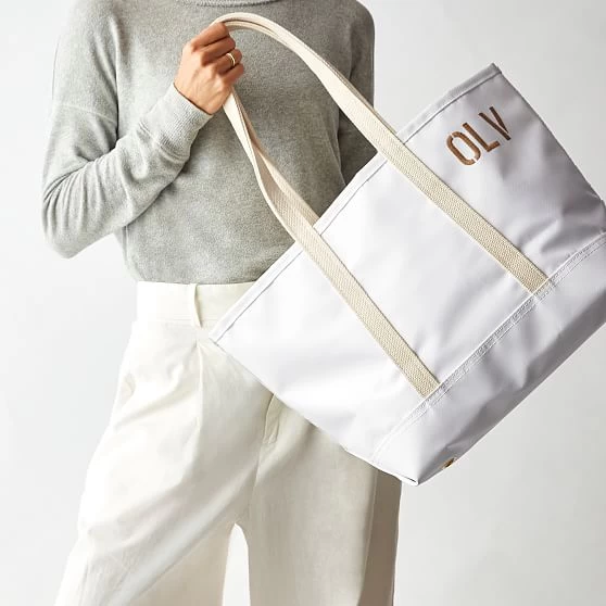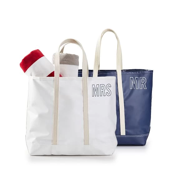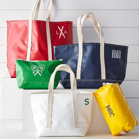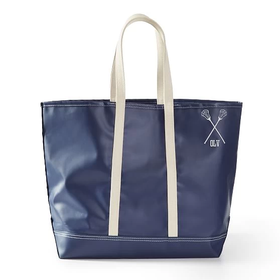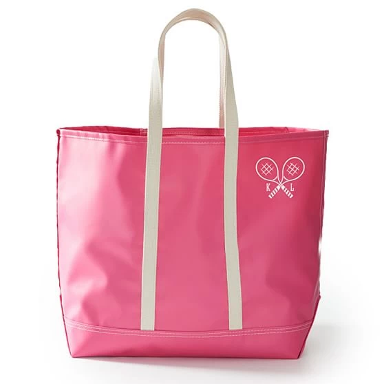 Thoughtfully made from water and tear-resistant vinyl, this do-it-all tote is useful year-round as a beach bag or a weather-resistant carryall. This oversized carryall is lightweight yet super durable and has long comfortable straps for toting all the essentials for a family fun day. There is an inside pocket for your phone, keys or sunscreen, and two brass grommets along the bottom. All it takes is a simple shake to empty any unwanted sand or pebbles. Add a name or a monogram to make it one of a kind.