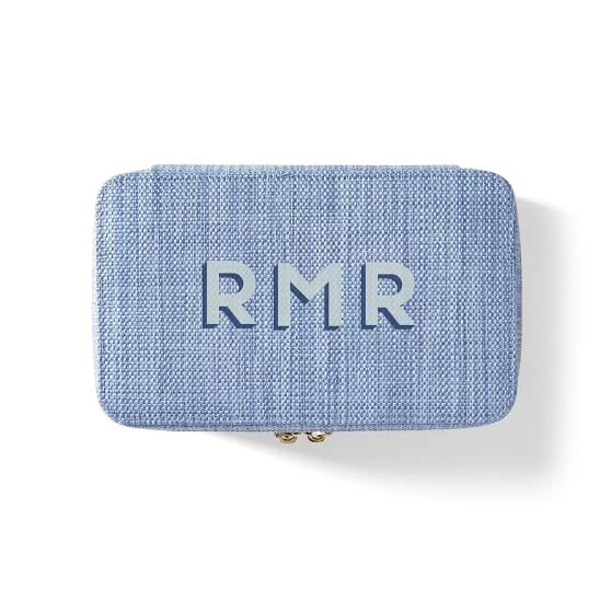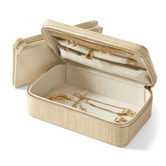 The perfect monogrammed gift for any occasion. We’ve refreshed our best selling Travel Jewelry Case with a natural raffia finish. Thoughtfully designed with storage for all your favorite pieces, this handy little case is perfectly sized for weekends away or display on your dresser. It opens to reveal a luxe linen interior with mirror and plenty of compartments for rings, necklaces, earrings and more.