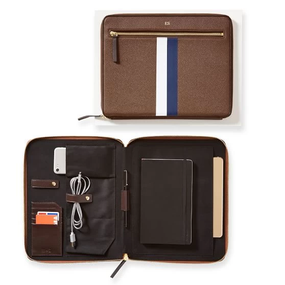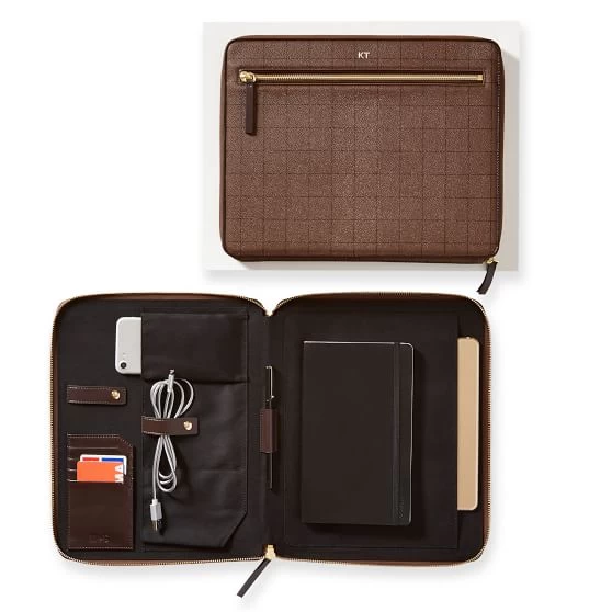 Keep your everyday tech essentials organized with this vegan leather tech folio. Available in your choice of our signature windowpane print or a graphic stripe design, the zip around closure opens completely to reveal a slip pocket designed to hold an iPad, notebook, papers or your phone. The folio also has multiple card slots and plenty of pockets for everything else you need. Add a foil debossed monogram for a personal touch.