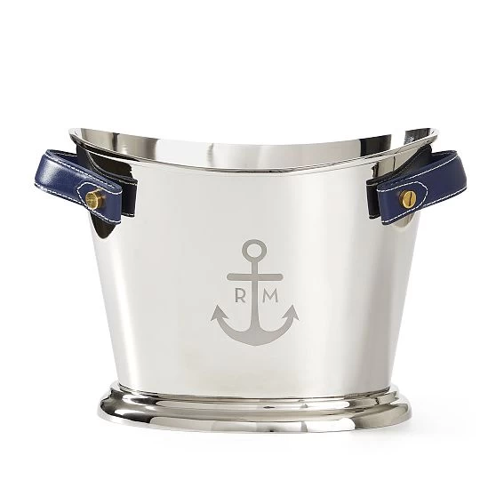 A stunning centerpiece for any occasion, the Montauk Silver Party Bucket brings timeless style to any host’s repertoire, especially when it features a custom monogram. Can be used as an ice bucket or a wine chiller, or simply as a stately décor piece. Crafted from highly polished nickel-plated steel, it features stitched vegan leather handles affixed with gold brass rivets. Add a monogram, name or special message for a one-of-a-kind touch.